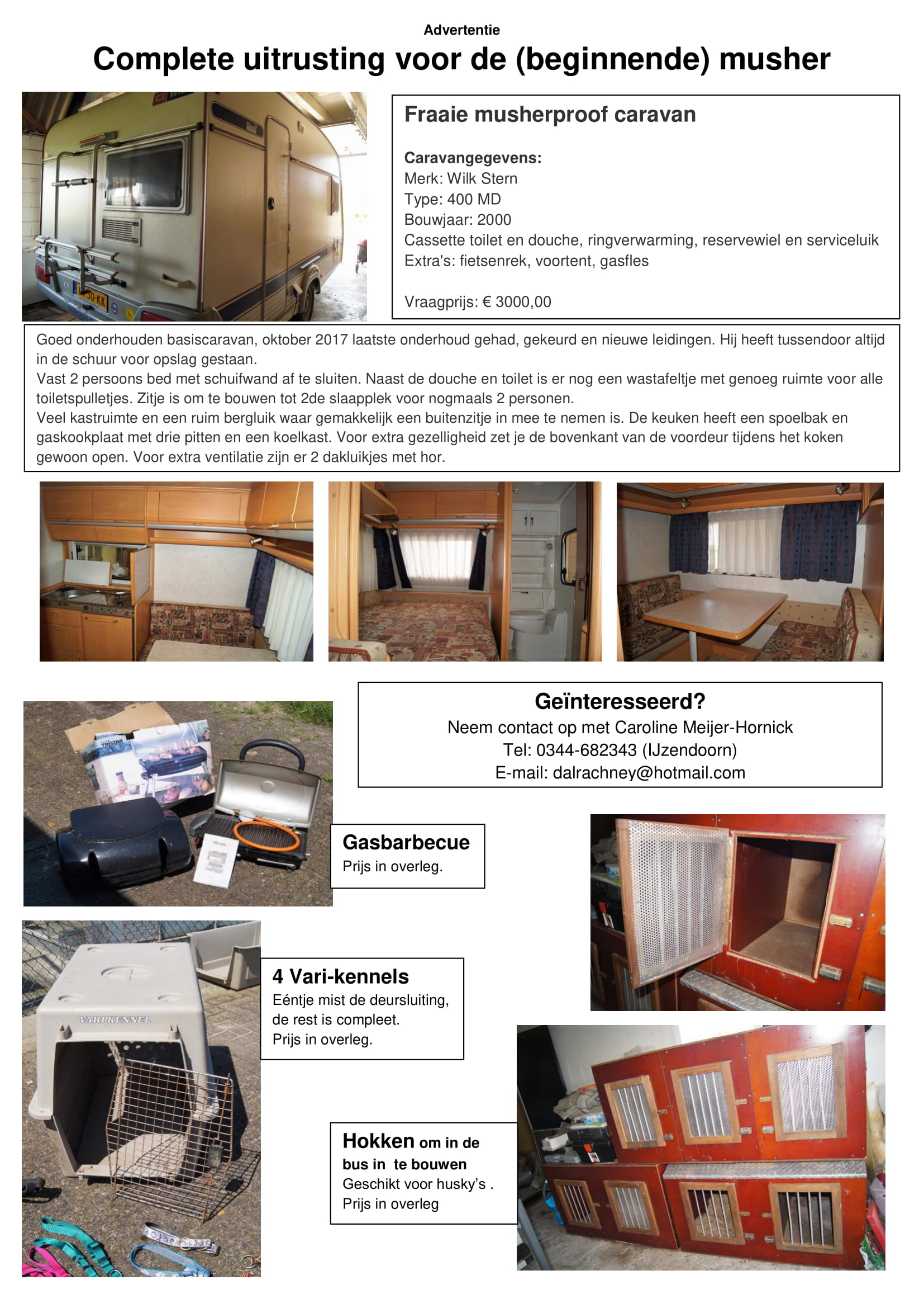 Deze pagina is bedoeld voor leden om artikelen aan te bieden die gerelateerd zijn aan de sledehondensport, of om geboorteberichten te plaatsen. Het is niet bedoeld voor reclame of aanbiedingen. Voor een plaatsing kan contact worden opgenomen met Wendy Metz (wendy.metz@dassc.nl)